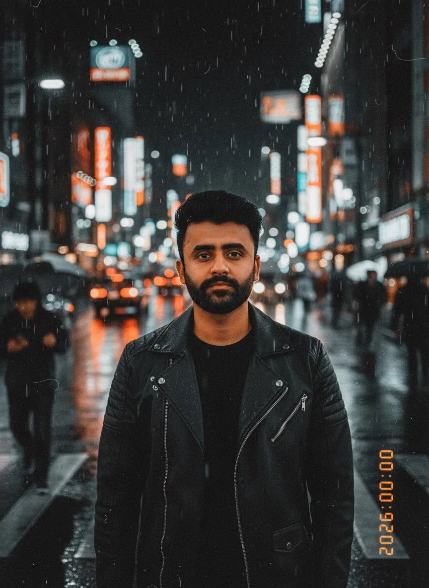 专业的复古电影风格人像摄影,画面中是使用上传的第一张肖像进行严格的身份验证(保持面部、发型、肤色、年龄不变);人物面部自然磨皮,皮肤状态好,人物面部强烈的光影对比,在一张街头摄影肖像中,上传的人物站在一座繁忙城市雨夜的街道中央(东京的繁华街道夜景),主体处于特写视角下处于画面正中央。背景中的交通流(车辆与行人快速飞驰呈现动态线条模糊感)和霓虹灯呈现出动态的模糊效果,同时还有涂抹效果的纹理来营造叙事感;昏暗的灯光带有高对比度,湿漉漉的路面反射出温暖的橙色和冷色调的霓虹光,路灯/汽车前灯投射出柔和的光斑。色彩调子:以黑白为基础,对霓虹色部分进行高饱和度处理,以暗色调为主,呈现温暖与冷色调的对比。添加了胶片颗粒纹理、深度断裂细节、电影式黑色美学、超逼真的超精细质感。雨滴滴落在镜头上的逼真效果;慢门拍摄,大光圈,较低的快门速度;右下角添加橙色竖排版的数字日期水印(2026:00:00)