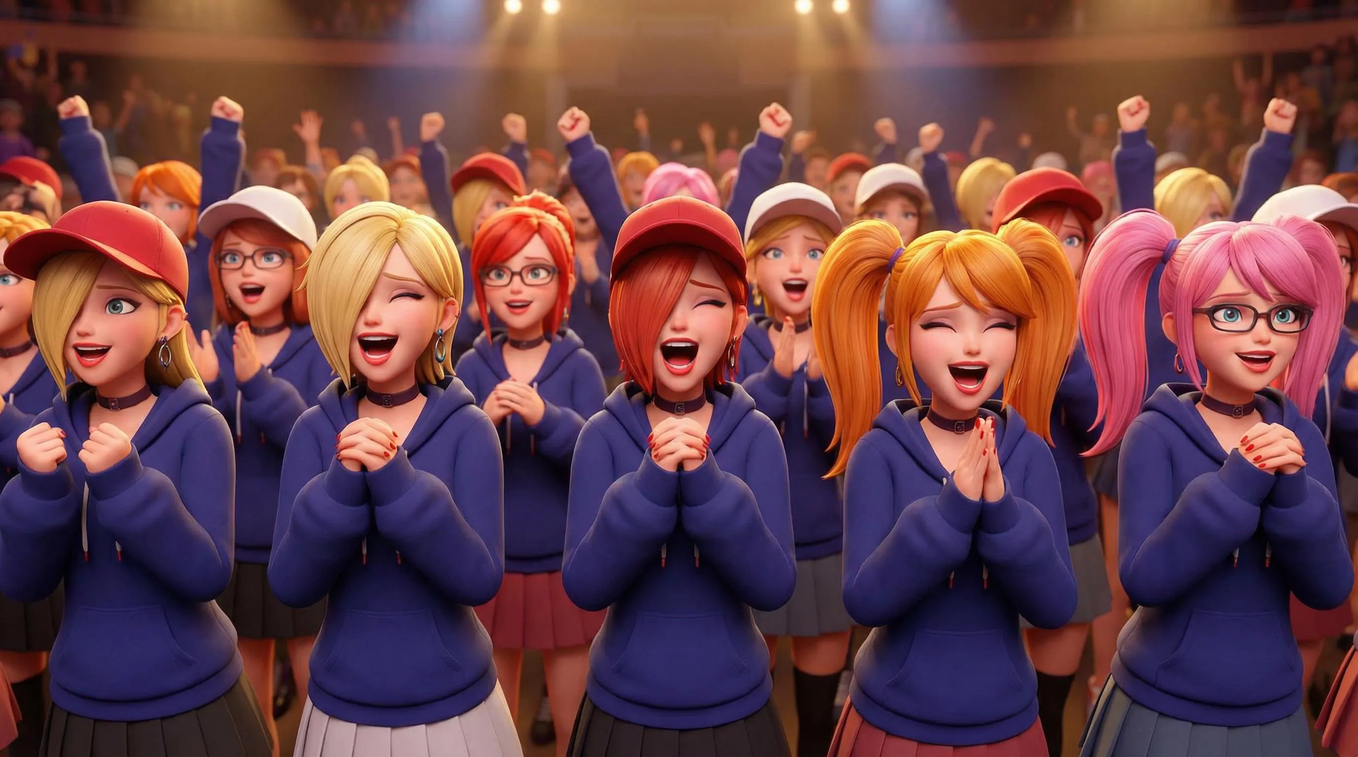 Create anime-inspired CGI crowds with Final Fantasy hairstyles in deep blue hoodies featuring moe sleeves hiding praying hands. Vibrant accessories like baseball hats, chokers, and colored nails. Generate diverse characters with elated expressions, side-swept hair, and unique sleeve styles using this AI image generator for vivid fan art scenes.