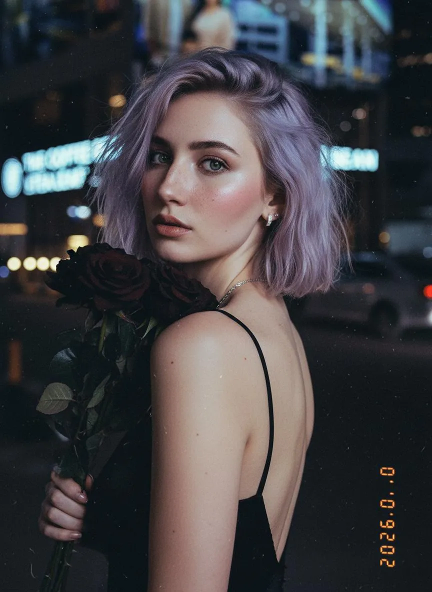 不改变上传的人物的原本的面容,超写实肖像照片,特写镜头,浅景深(背景模糊),上传的图中人物(面部特征保持不变),一头凌乱的浅紫色灰褐色齐肩长发,绿色眼睛,淡淡的粉色腮红,裸粉色嘴唇,脸颊和肩膀上有淡淡的雀斑,身着黑色无背扣的细肩带连衣裙,戴着小耳钉和细链项链,手捧一束黑色玫瑰贴近脸颊,半身转身看向镜头;拍摄角度:平视视角,夜景闪光灯强烈的对比光,冷色调调色板(黑色、浅紫色灰褐色、苍白肤色、城市夜景背景),忧郁而梦幻的氛围,高细节度,胶片质感,复古色调,胶片复古写真,颗粒感,胶片漏光效果,高清细节 ;右下角添加橙色竖排版的数字日期水印(2026:00:00)