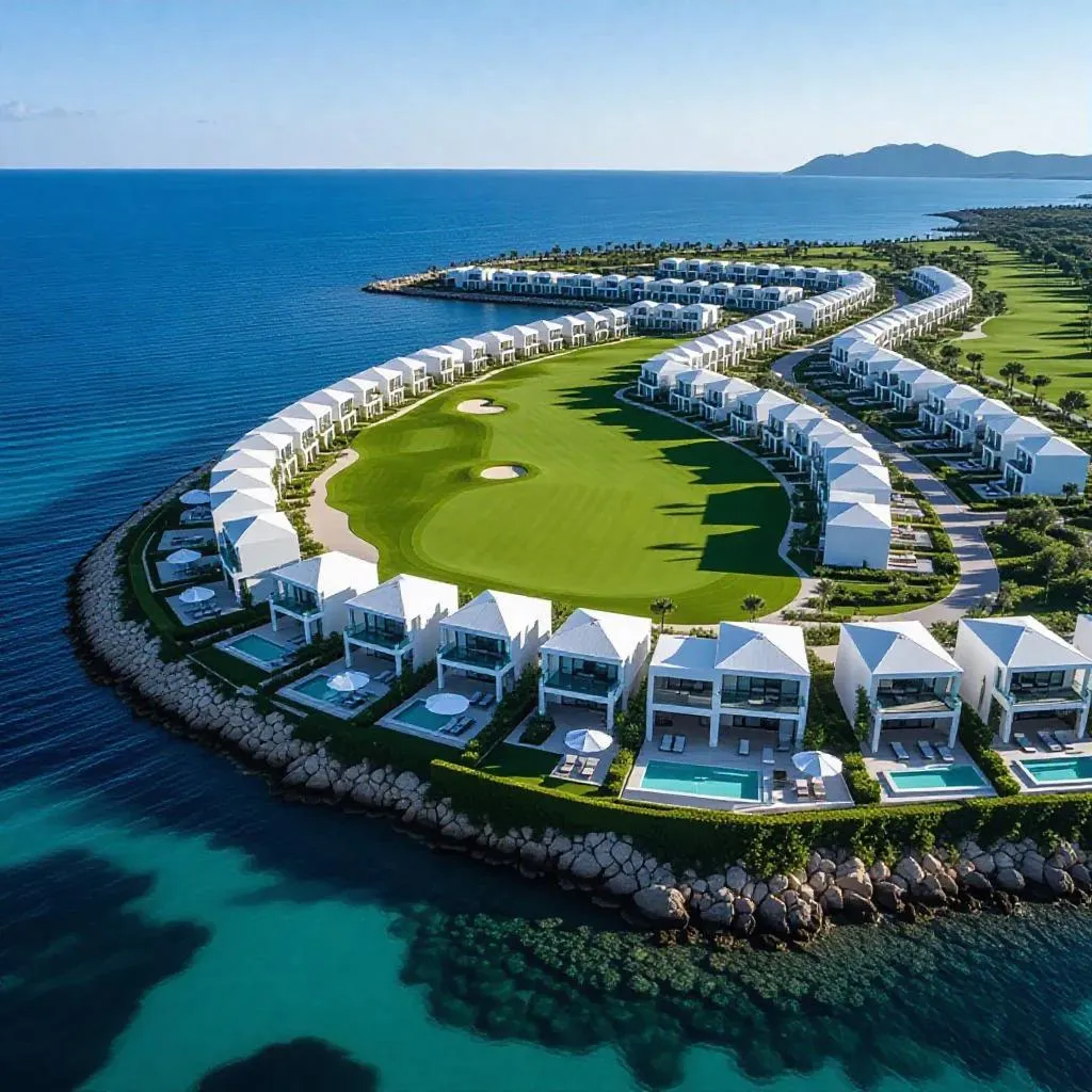 Generate an aerial-view Resort Beach & Golf Club image with a vibrant golf course meeting azure seas, featuring a central clubhouse surrounded by crisp white Greek-inspired villas. Create AI-powered visuals for travel or real estate with vivago.ai’s precision tools. Ideal for luxury lifestyle or coastal property marketing.
