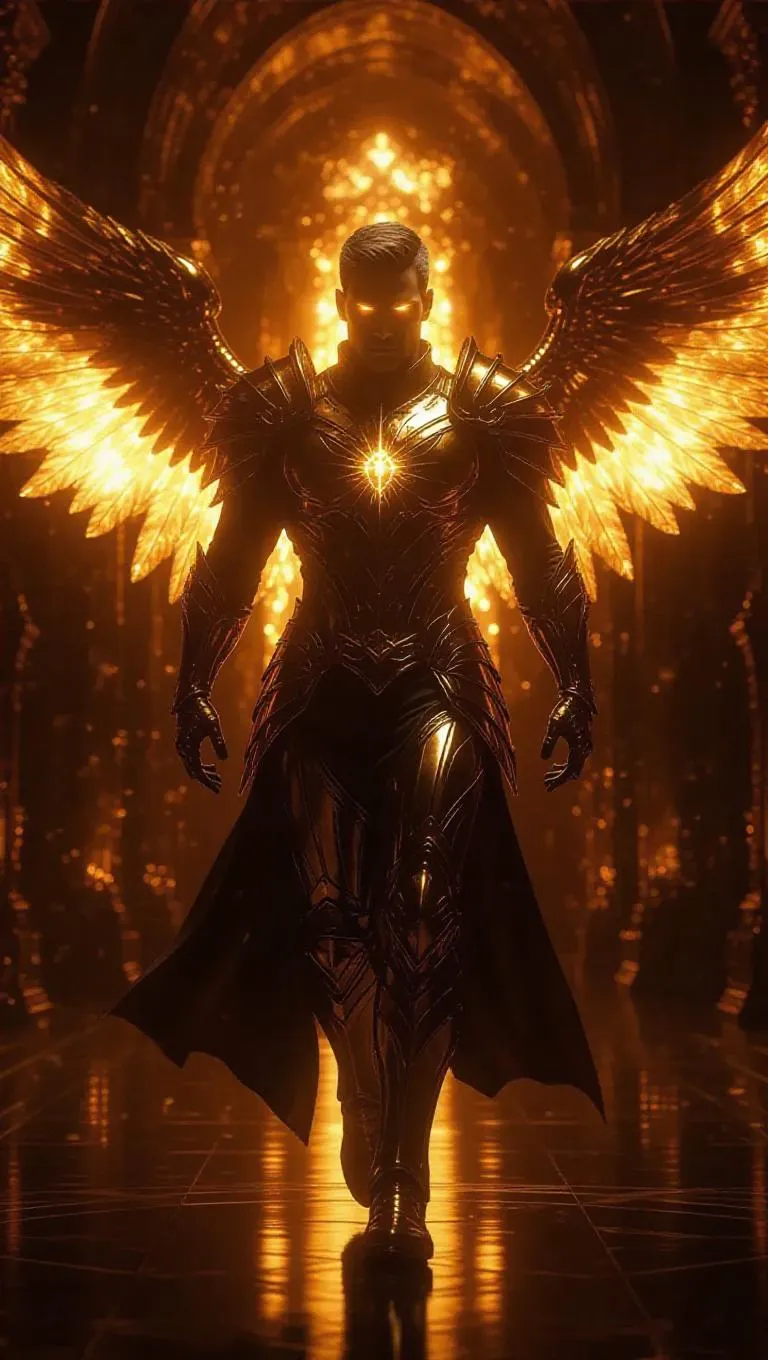 Generate a hyper-realistic 4K AI image of a celestial archangel with blazing golden eyes, molten gold armor forged from divine flames, and sun-kissed skin. Explore heavenly vibes as he strides through a grand hall of sacred light and fire, glowing with fiery patterns and golden arches. Transform prompts into stunning visuals with AI-powered creativity.