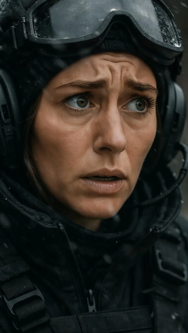 Text to ImageClose-up of the woman’s face, tactical rugged dressed wide eyes, breath visible in cold air. Straining to listen, expression caught between fear and disbelief. Dramatic realism, shallow depth of field.Recreate