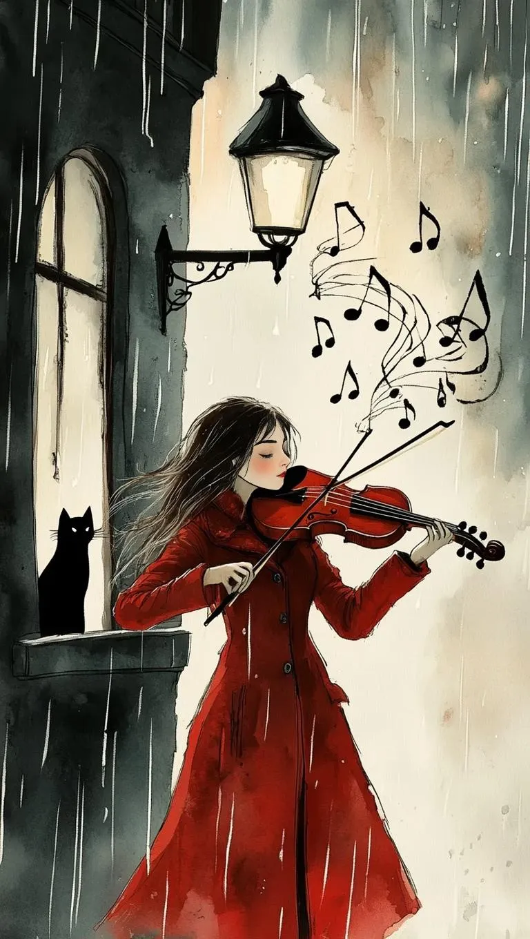 Immerse in a cinematic anime watercolor scene where a violinist in a red coat conjures glowing ink ribbons under a flickering streetlamp. Rain-soaked melancholy meets chiaroscuro lightplay, with a watchful black cat and expressive brushwork fading into ethereal shadows. AI-powered artistry brings spellbinding emotion to life.