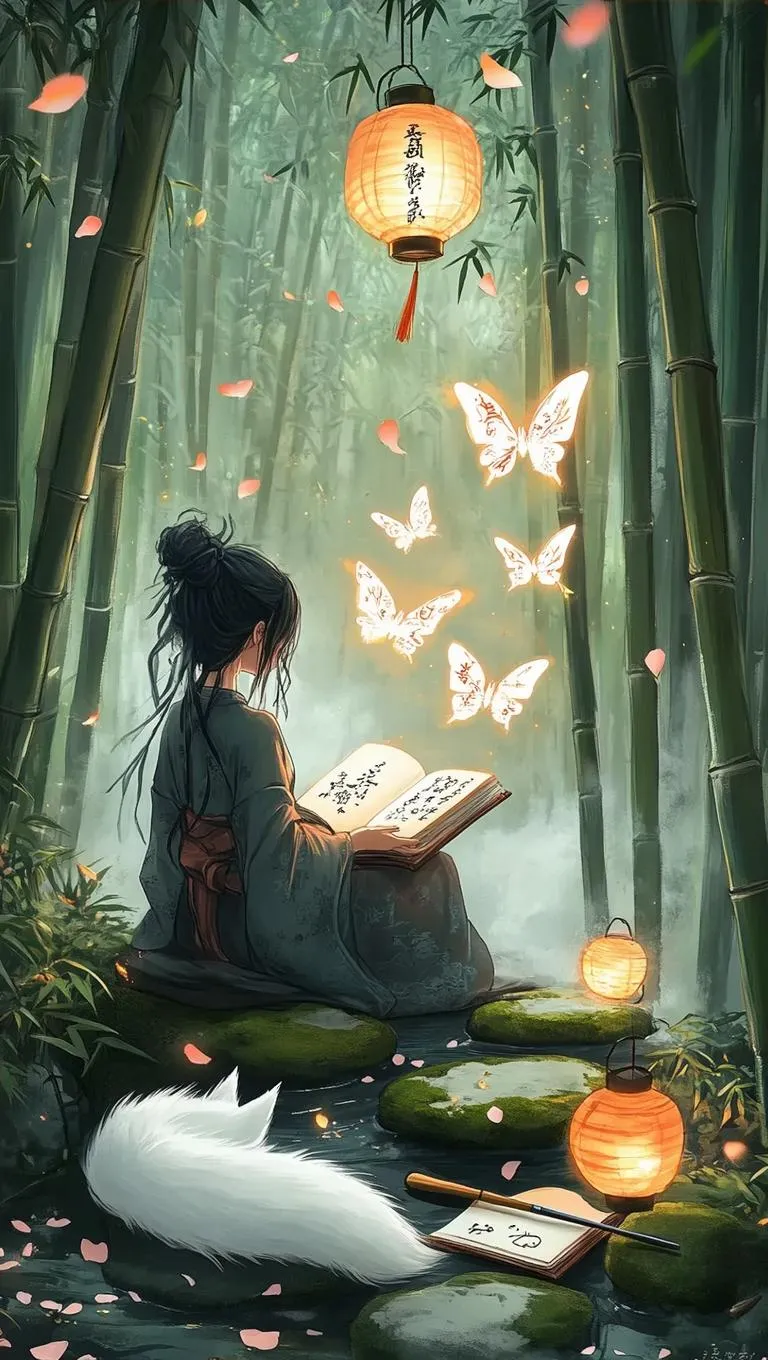 In a misty bamboo forest, an anime-style girl with ink-like hair sits on moss-covered stones. Before her, a floating book transforms into glowing butterflies, their wings etched with calligraphy. Paper lanterns hang from high branches, casting warm light on scattered scrolls and brushes. A white fox spirit dozes beside her, tail curled around a jade inkstone. Petals and fireflies drift through the air, creating a tranquil, poetic, and enchanted scene painted in flowing watercolor textures with soft East Asian magical realism.
